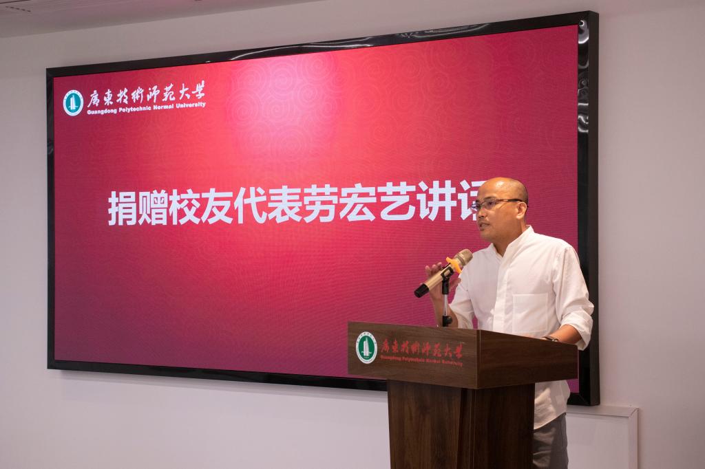 捐赠校友代表劳宏艺在致辞中表达了对母校培养的感恩、对学校发展成就的自豪,以及对母校对校友和校友工作的重视表示衷心感谢,希望广大校友一如既往的支持母校发展,共同把学校建设好,把校友会建设好。