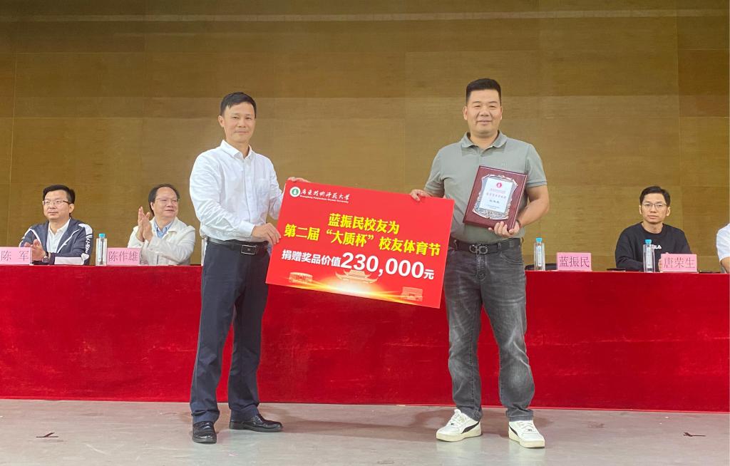 在随后的捐赠仪式上,校友们向母校表达了深情厚谊,其中:潮州校友联络处主任、1998届管理学院校友蓝振民捐赠价值23万元的“大质”凤凰单丛茶一批,2009届外语学院校友许美玲捐赠价值1.8万元的“贝琳达”不锈钢锅具一批,2013届管理学院校友蓝海龙捐赠价值1.3万元的筋膜枪一批,作为本届校友体育节的赛事奖品;2006届美术学院校友劳宏艺和校友乒乓球俱乐部分别向体育专项基金捐赠1万元,校友羽毛球俱乐部向体育专项基金捐赠6000元。